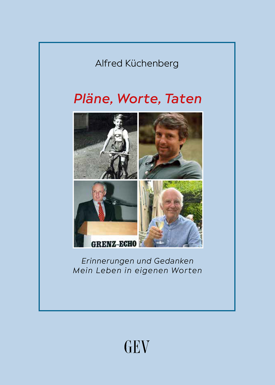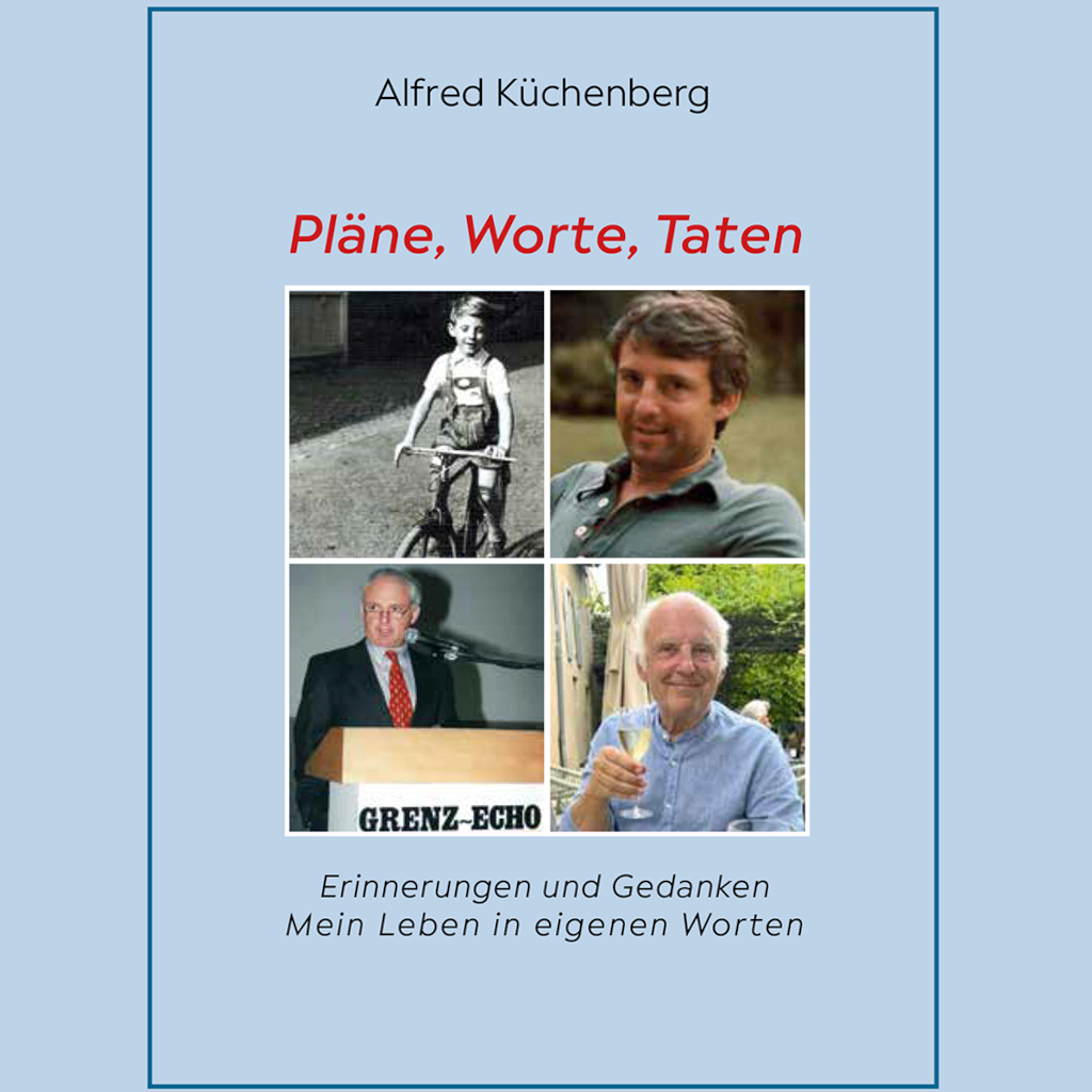 Nach seinem viel beachteten Buch „Das Haus der Briefe“ betrachtet Alfred Küchenberg nun die Zeitspanne von 1945 bis heute. Das vorliegende Buch „Pläne, Worte, Taten“ erzählt sein eigenes Leben, eingebunden in die Gesellschaftsgeschichte seiner Zeit, in dem weiten Umfeld, in dem er lebt und gelebt hat. Ein wichtiger Teil bezieht sich auf sein Wirken als Verleger des GrenzEcho, verbunden mit historischen Aspekten der Zeitung, die bis heute so nicht bekannt sind.