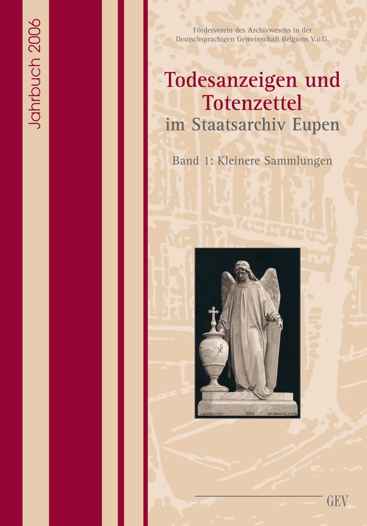Seit seiner Gründung sind dem Staatsarchiv Eupen über 20.000 Todesanzeigen und Totenzettel übergeben worden. Da lag es nahe, diese nicht nur für Familienforscher aufschlussreiche, wertvolle Quelle einem breiteren Publikum zugänglich zu machen. Erfasst wurden in diesem Band rund 8.000 zwischen 1818 und 2004 entstandenen Todesanzeigen und Todeszettel.